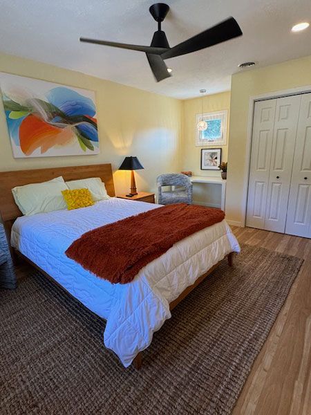 The entire home is accessible to guests, except for one locked hospitality room containing our cleaning and restocking supplies and the garage.